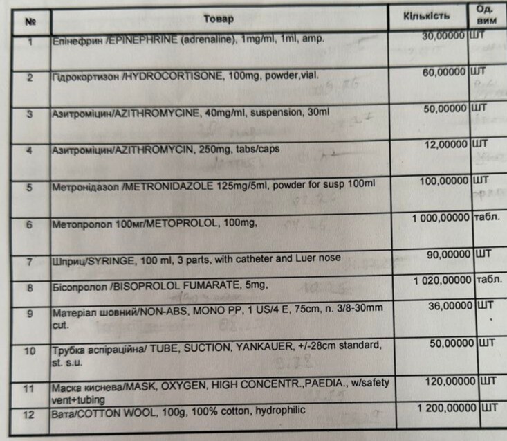 Заклад отримав допомогу у вигляді медичних препаратів, зокрема: епінефрин, гідрокортизон, азитроміцин, метронідазол, метопролол, бісопролол та інших медичних виробів.