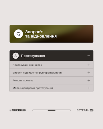 🔹 Протезування — протези кінцівок, вироби підвищеної функціональності, ремонт протезів і мапа центрів протезування.