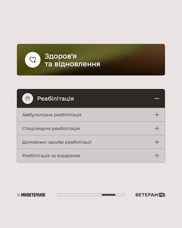 🔹 Реабілітація — амбулаторна й стаціонарна, допоміжні засоби реабілітації, а також можливість реабілітації за кордоном.